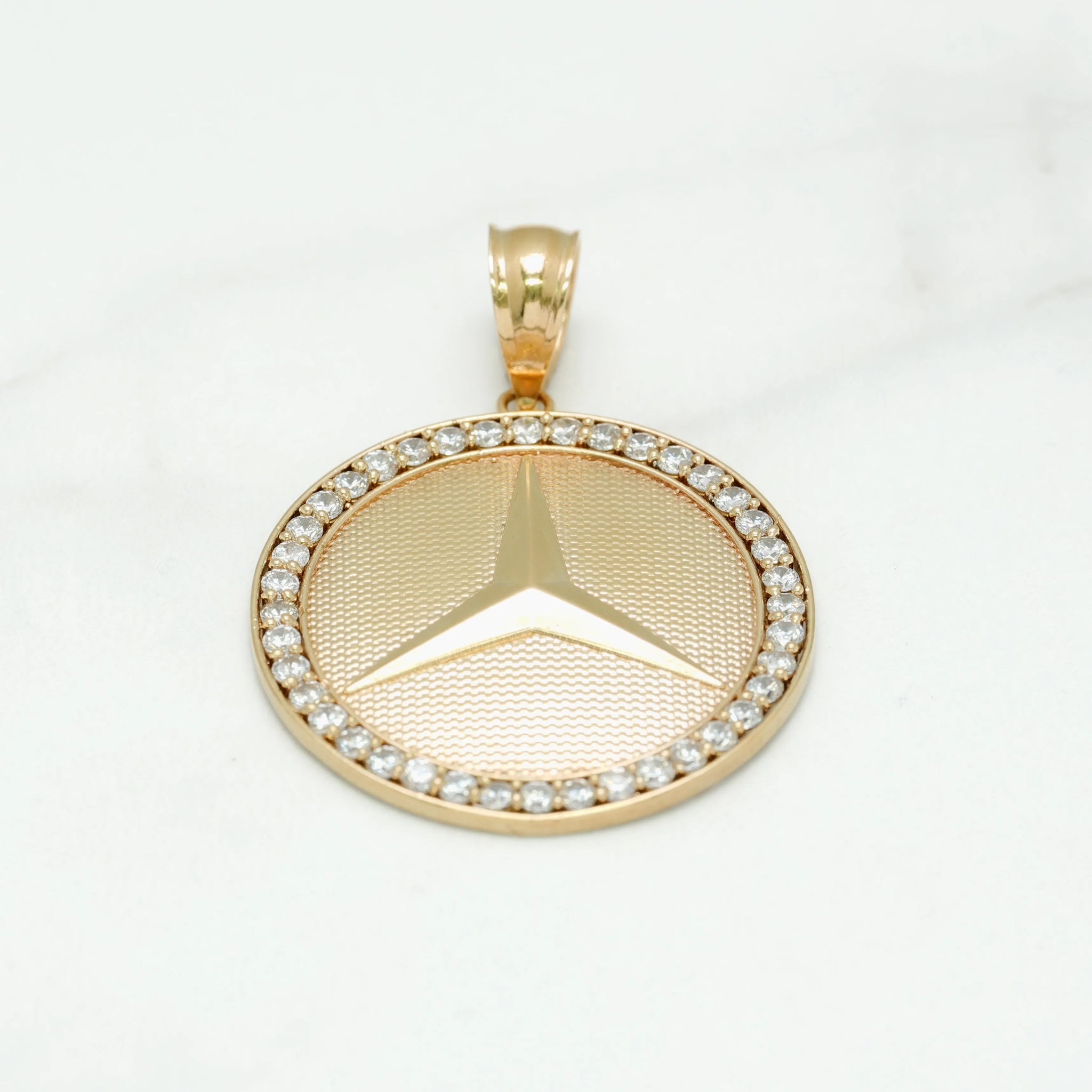 Ce pendentif en or 10K jaune en forme de médaillon Benz, pavé de zircones cubiques (cz), incarne l'élégance et le prestige. Parfait pour ceux qui souhaitent afficher leur goût pour les marques de luxe avec une touche scintillante.